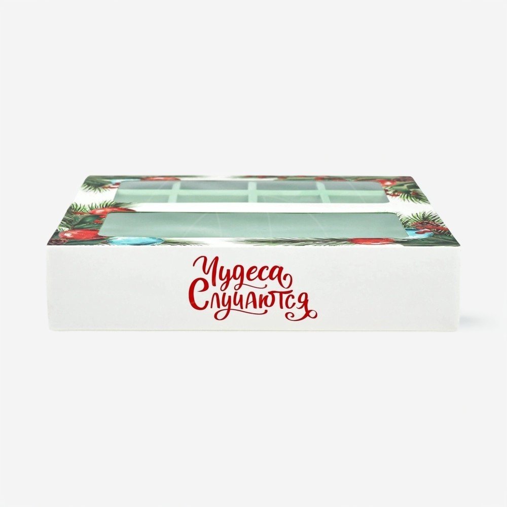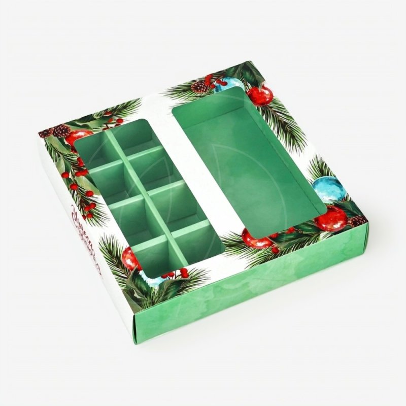 Коробка на 8 конфет и шоколадную плитку с окном "Новогодние веточки" 17,7х17,8х3,8 см