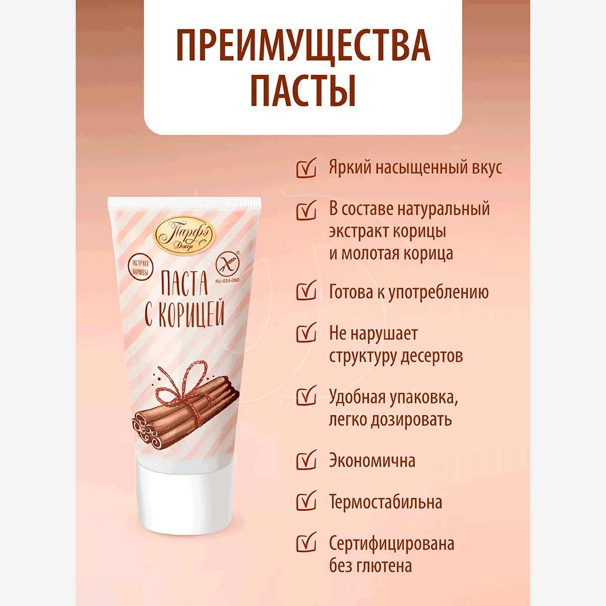 кондитерская паста с добавлением натуральной корицы станет отличным выбором для любителей выпечки и сладостей. Продукт разработан специально для тех, кто ценит изысканный вкус и заботится о своем здоровье. Паста не содержит глютена, что делает ее подходящей для людей с особыми потребностями в питании. Этот продукт идеально подходит как для профессиональных кондитеров, так и для домашнего использования.
