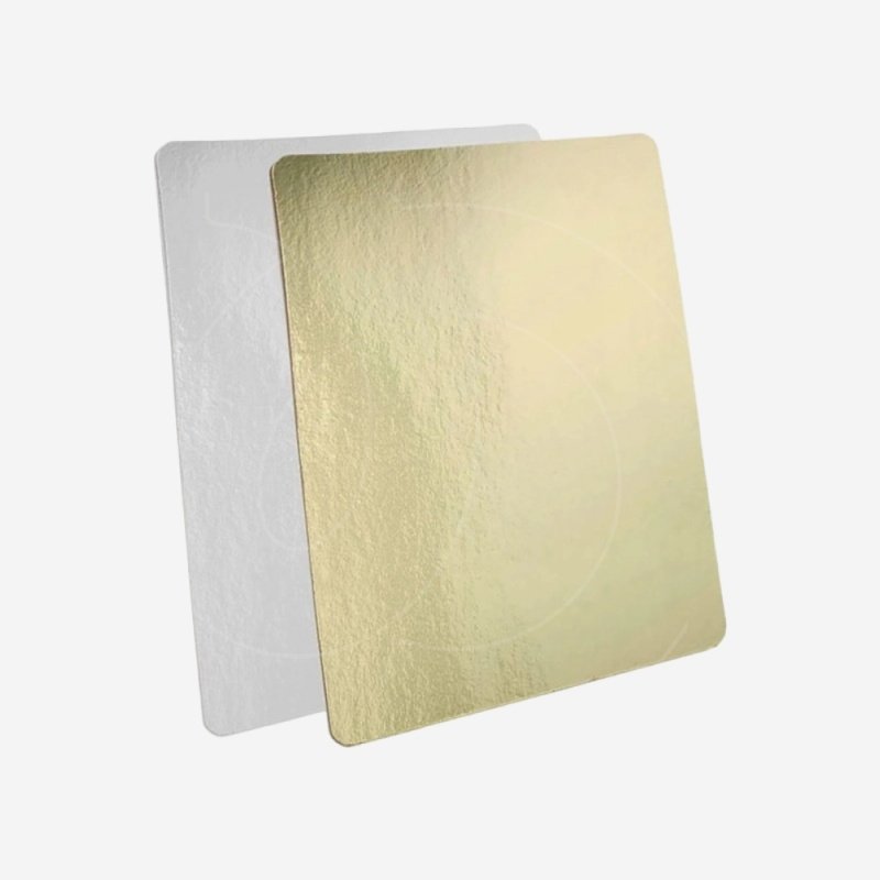 Толстая картонная подложка светлого золотого цвета с одной стороны и серебряного с другой. Используется как многоразовый поднос для тортов и пирожных.