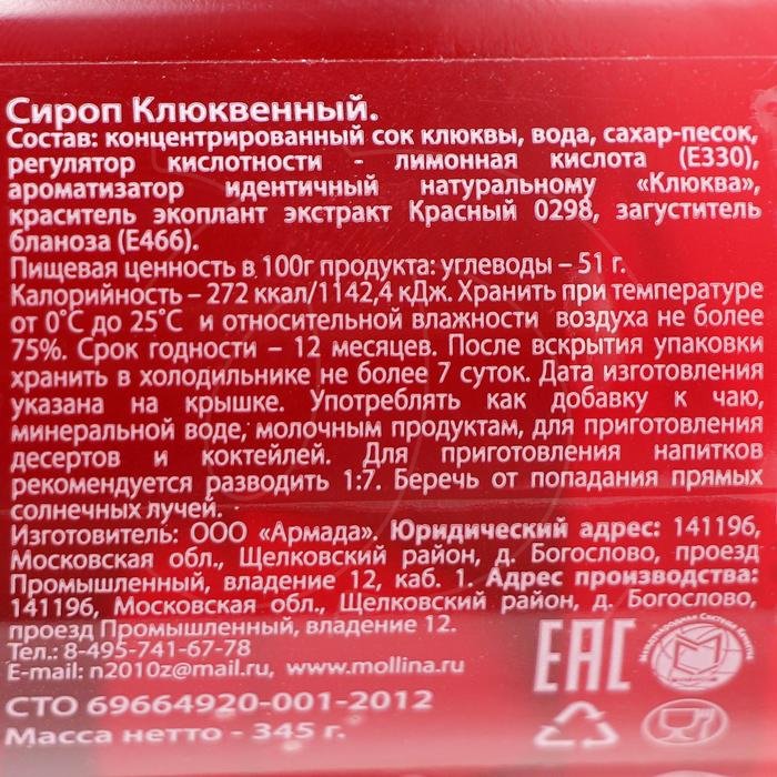 Доставка Сироп Mollina "Клюква" 345 г из магазина в вашем городе: